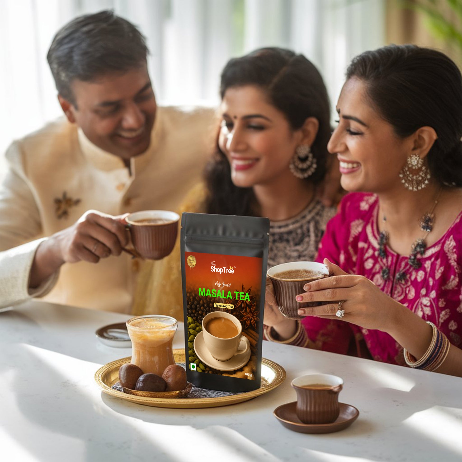Discover the true taste of Ooty with The ShopTree Ooty Special Masala Tea. This handcrafted blend combines premium CTC tea leaves with freshly ground spices, offering a bold, flavorful, and aromatic cup of chai every time. Our recipe is made with 100% natural ingredients – ginger, cardamom, cinnamon, nutmeg, cloves, and black pepper – blended in just the right proportions. No artificial flavors, preservatives, or premixed powders are added, ensuring a clean and authentic chai experience. Each brew delivers a rich golden-brown color, full-bodied taste, and uplifting aroma that can brighten your mornings, refresh your evenings, and comfort you on rainy or chilly days. The ShopTree Ooty Special Masala Tea comes in a convenient 100g freshness-sealed pouch that locks in the natural aroma and flavor of the tea till the very last scoop.